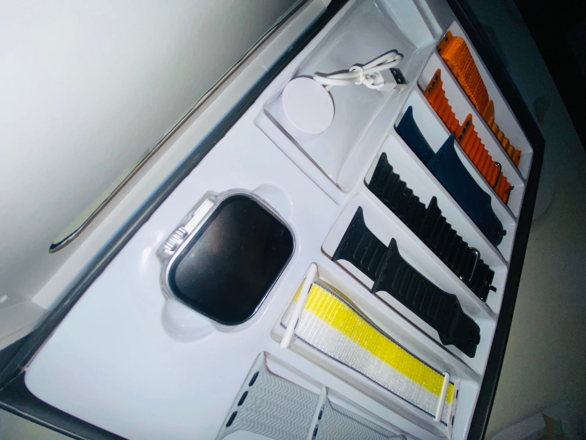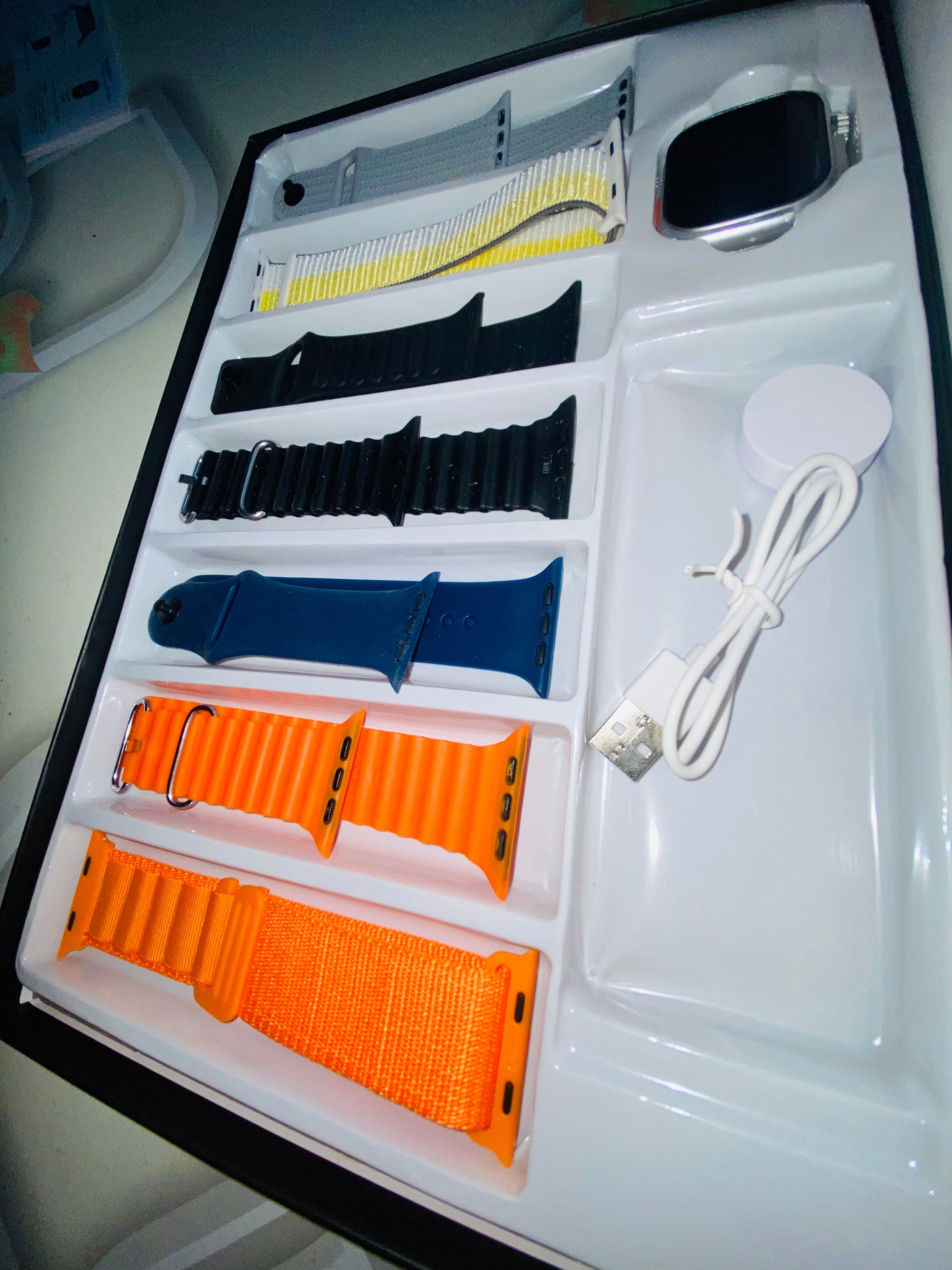 Upgrade your wristwear with this versatile smartwatch set featuring six stylish interchangeable silicone bands. Whether you're dressing up or keeping it casual, switch up your look effortlessly with black, white, orange, navy blue, green, yellow, and beige straps.
